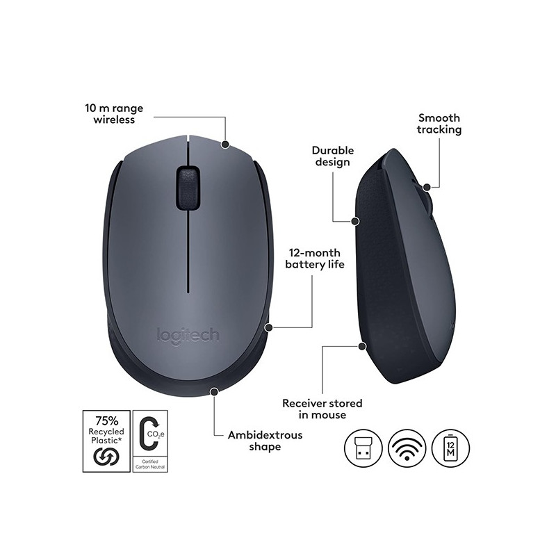 Logitech® M170 Wireless Mouse, choose the reliability of a cord with the convenience of wireless – and a 10-metre (33-foot) range – thanks to Logitech Advanced 2.4 GHz wireless technology. This affordable mouse works for 12 months on a single AA battery. Set up is simple – just plug the tiny wireless receiver into a USB slot. There’s no hassle with pairing or software installation, and M170 is compatible with Windows®, Mac and Chrome™.