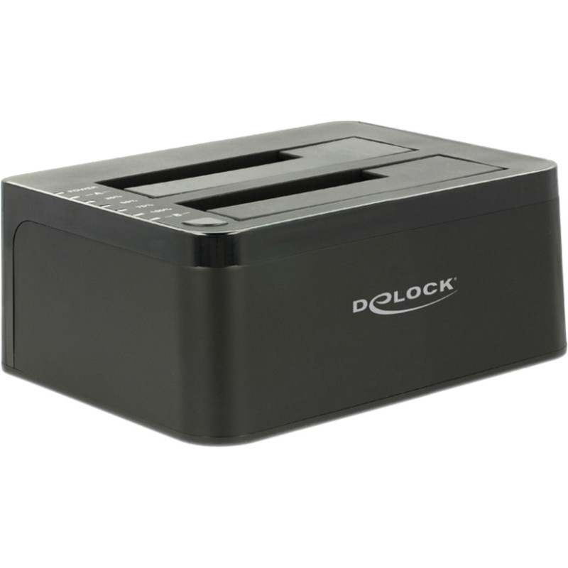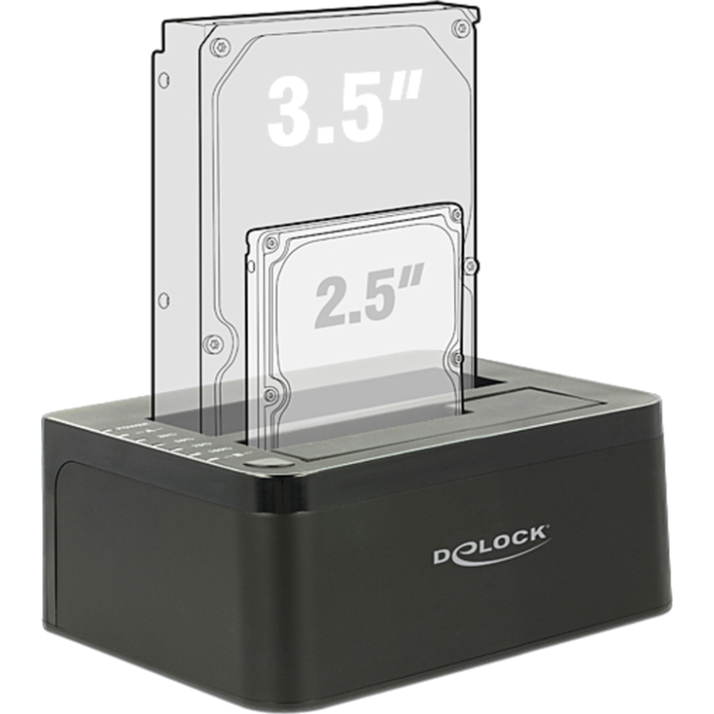 This HDD / SSD docking station by Delock enables an external connection of two 2.5″ or 3.5″ SATA HDDs / SSDs through the USB interface. This solution does not requires an external enclosure since the HDD / SSD will be plugged into the docking station directly. Furthermore the clone function enables to copy the content of one HDD to another without using a PC.
